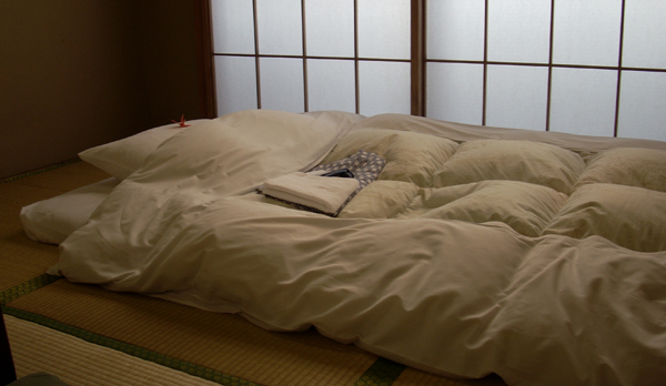A futon is a flat mattress with a fabric exterior stuffed with cotton, wool, or synthetic batting that makes up a Japanese bed. Futon is generally referring to the traditional style of Japanese bedding consisting of padded mattresses and quilts. It can be folded and stored away during the day, while allowing the room to serve for purposes other than as a bedroom. According to Japanese lore, the first futons were said to be crafted by samurai who couldn't master the art of sword play.n addition, many Japanese beat their futons regularly using a "futon tataki", a special implement, traditionally made from bamboo. A Japanese bed is not as simple as a mattress over a box spring. Rather, the following combination of elements synthesize into a pleasant, comfortable sleeping experience: